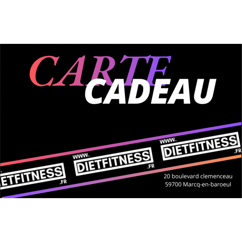 La Carte Cadeau Dietfitness permet d’acheter librement whey, créatine, compléments alimentaires, accessoires et snacks protéinés.