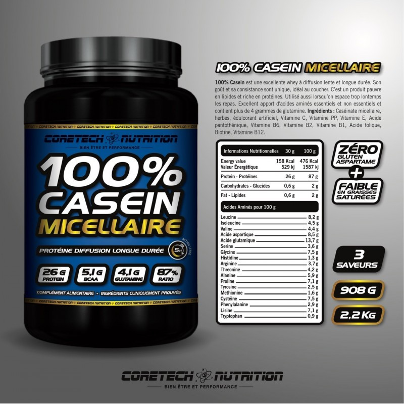 La caséine micellaire représente environ 80 % des protéines du lait. Contrairement à la Whey, elle forme un gel dans l’estomac, ce qui ralentit sa digestion. Résultat : une libération continue d’acides aminés pendant 6 à 8 heures.